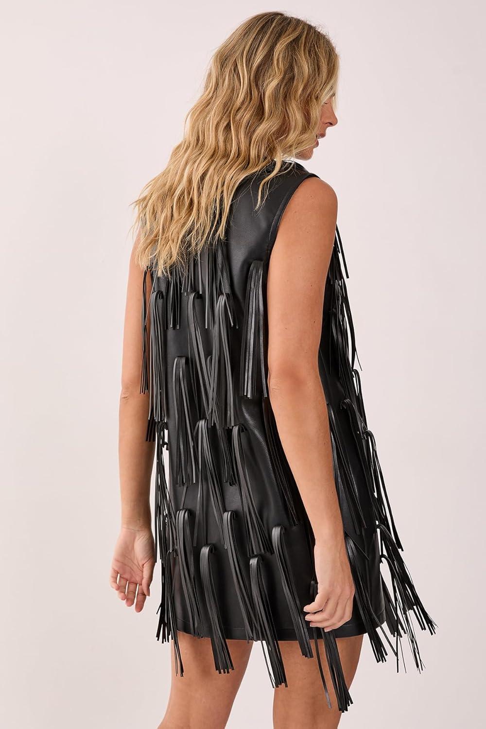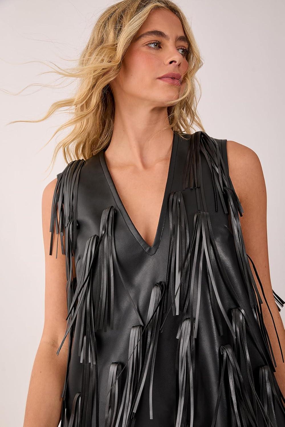 Make an unforgettable entrance in this show-stopping faux leather tassel mini dress from NastyGal. The dramatic cascading tassels create mesmerising movement as you dance the night away, whilst the daring plunge neckline adds a touch of allure. Style with chunky platform boots as shown for the ultimate rock-chic ensemble, or swap for strappy heels to create your own signature look. This statement piece requires minimal accessorising – simply add some bold cuff bracelets and you're ready to command attention. Perfect for club nights, cocktail parties or any evening event where you want to stand out from the crowd. The mini length showcases your legs beautifully, while the sleeveless cut allows for unrestricted movement on the dance floor. This is the dress that transforms an ordinary night out into an extraordinary one.