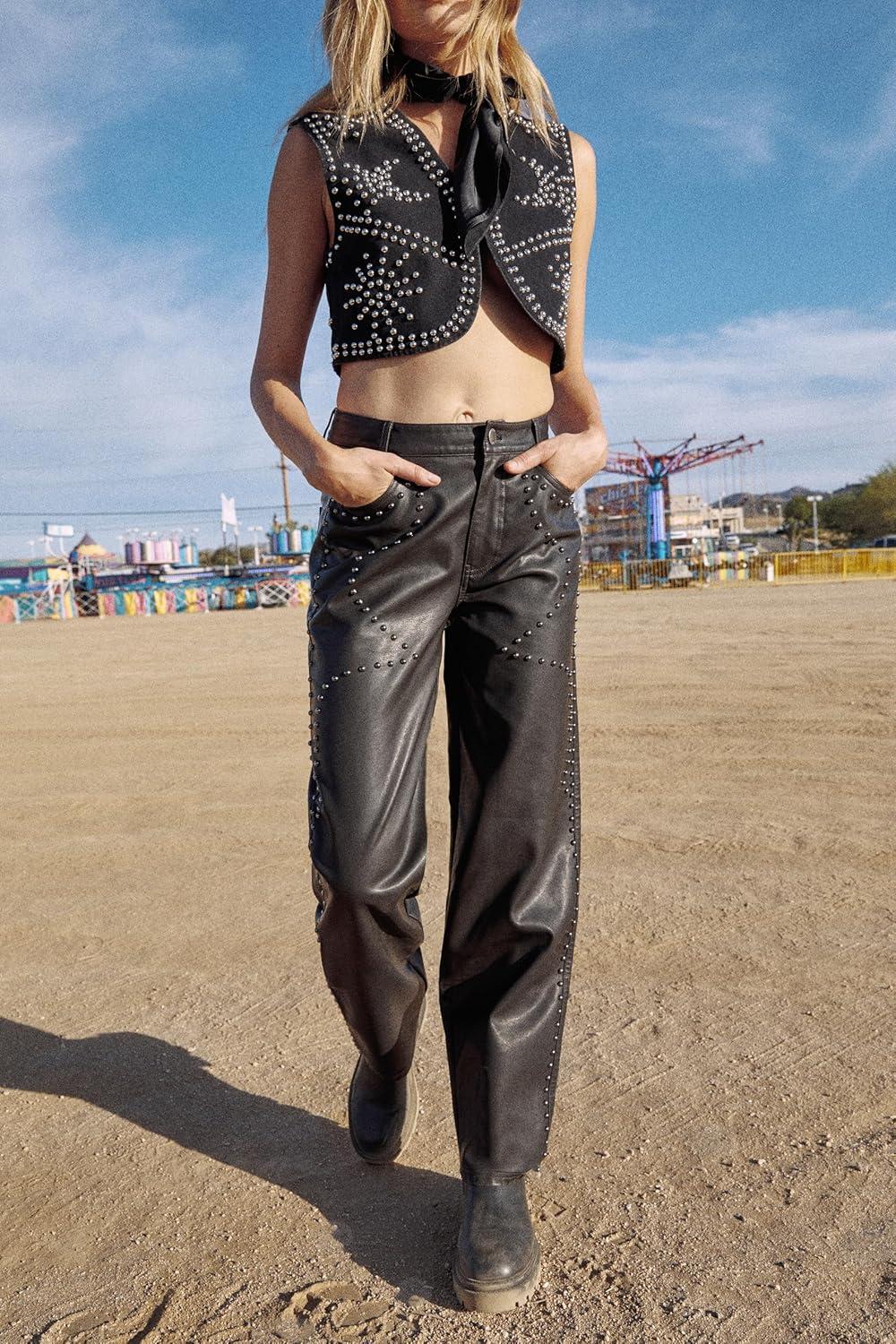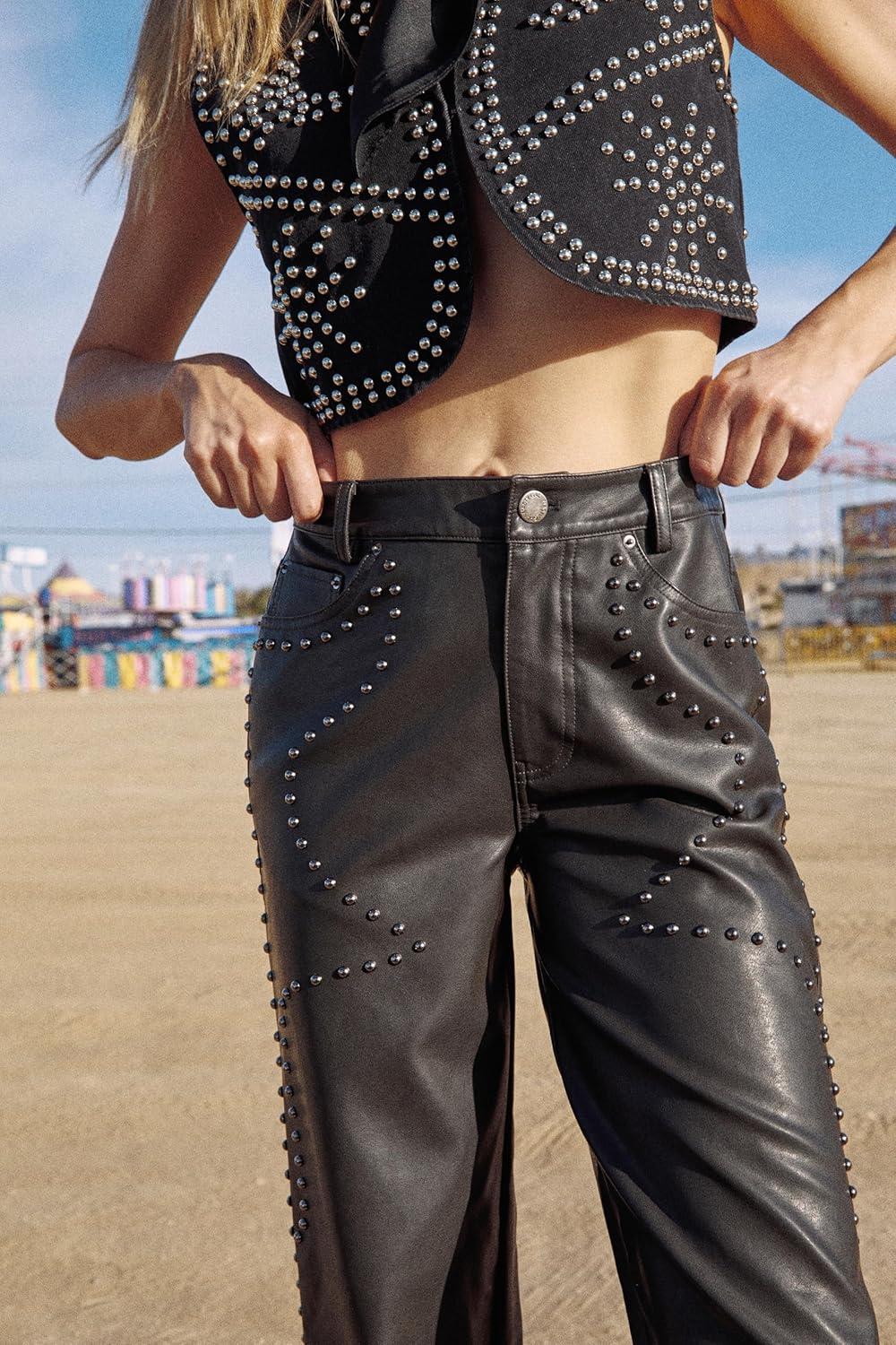 Nasty Gal Women’s Faux Leather Studded Straight Leg Trouser(Black)