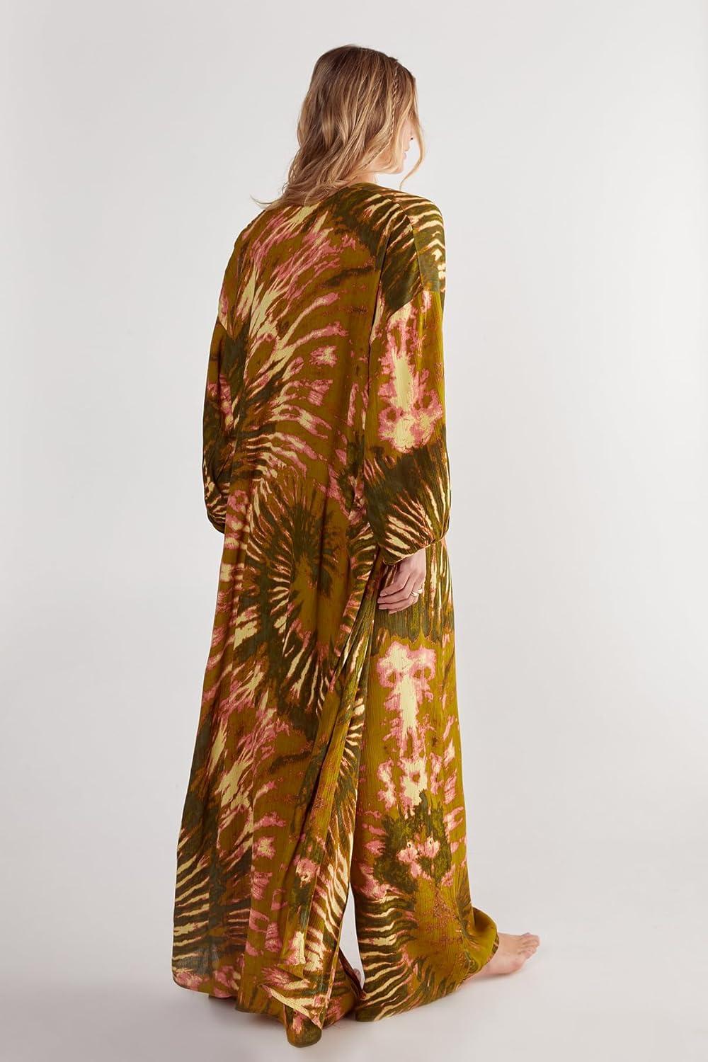 Women’s Crinkle Viscose Tie Dye Bandeau, Pants, Kimono 3pc Set(Khaki)
