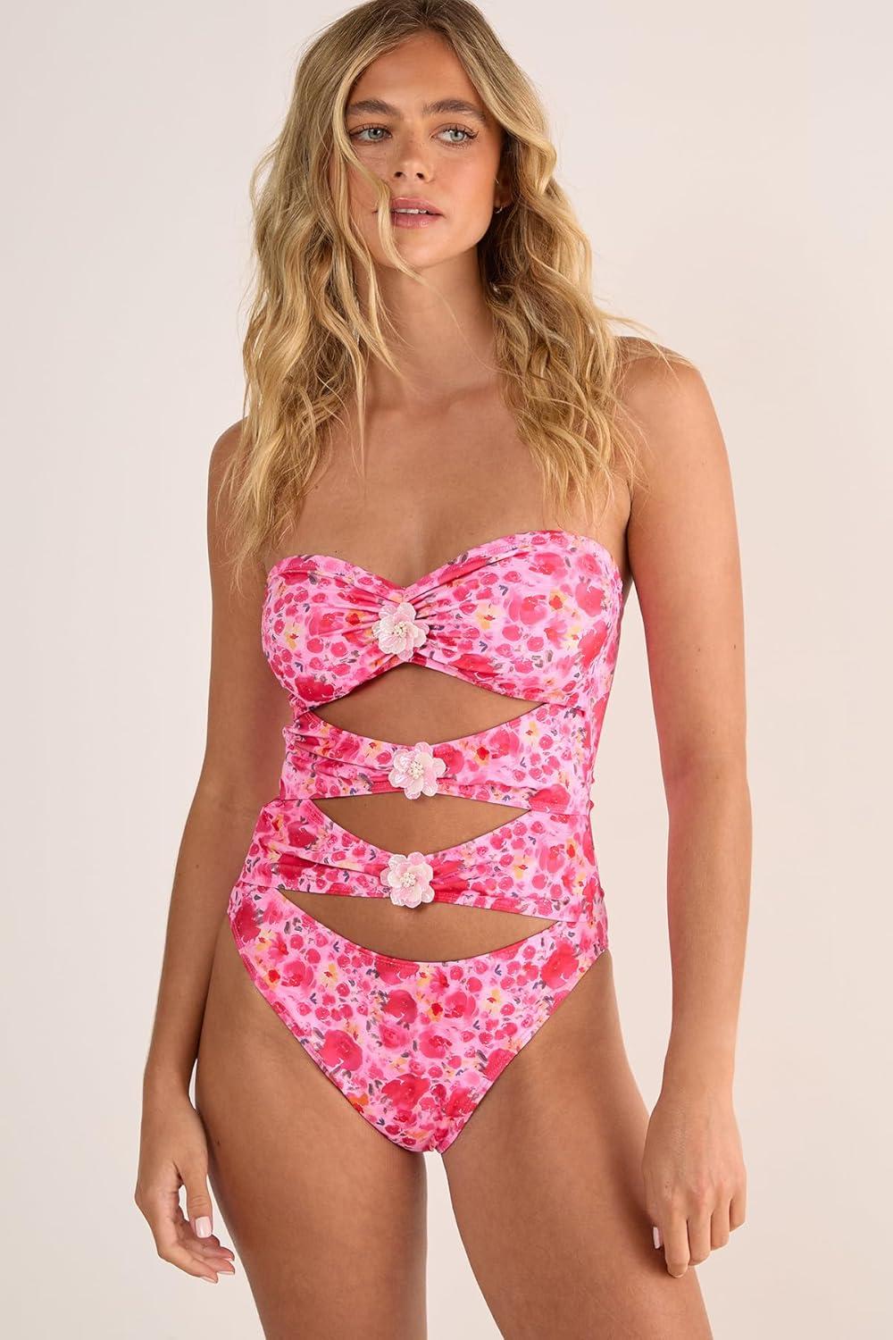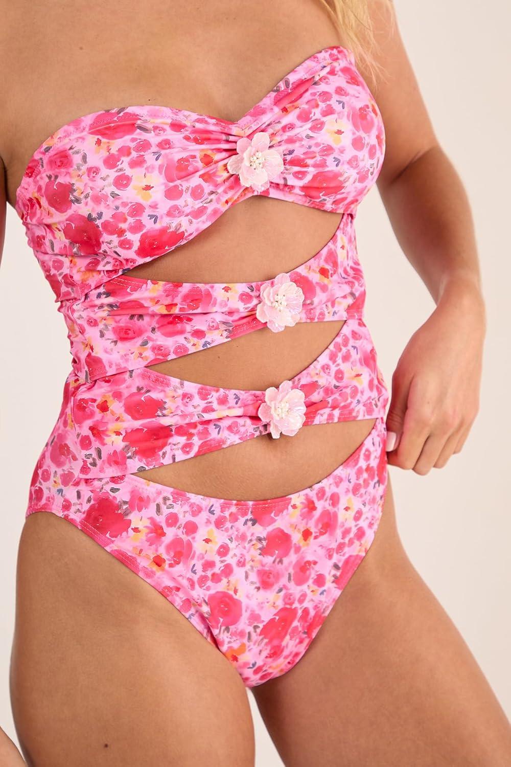 Women’s Floral Trim Cut Out Bandeau Swimsuit(Pink)