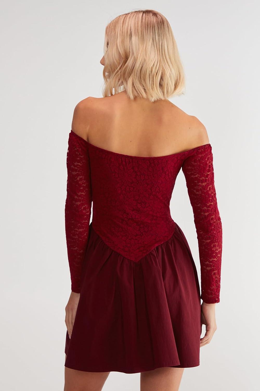 Women’s Lace Long Sleeved Tulle Hem Mini Dress(Wine)
